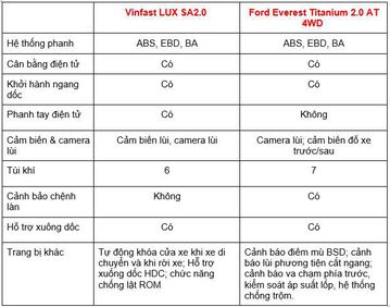 Danh sách trang bị an toàn trên Vinfast LUX SA2.0 và Ford Everest Titanium đều có đầy đủ các tính năng hiện đại như: hệ thống phanh trước/sau dạng đĩa, hệ thống chống bó cứng phanh, phối lực phanh khẩn cấp, hệ thống cân bằng điện tử, hỗ trợ khởi hành ngang dốc, cảm biến hỗ trợ đỗ xe trước/sau.