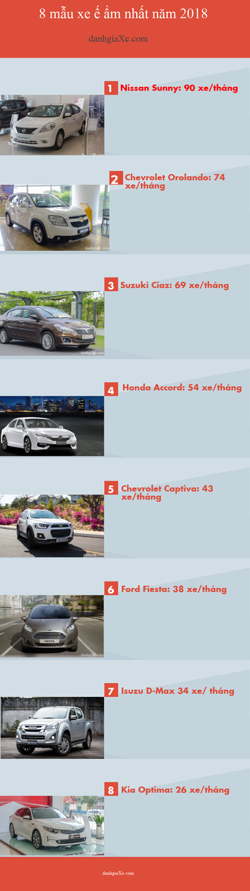 Dưới đây là danh sách các mẫu có doanh số thấp nhất trong năm 2018, được xếp hạng dựa trên tiêu chí trung bình doanh số chỉ đạt dưới 100 xe/tháng, là các dòng phổ thông trên thị trường, không bao gồm các xe đã ngưng nhập khẩu.
