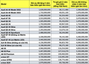 Khách hàng mua các dòng sedan Audi A4, A6, A8L, dòng Sportback Q5, A7 và dòng SUV Q2, Q3, Q5, Q7 và Q8 trong thời gian từ 16/06/2023 đến hết 30/09/2023 sẽ được tặng 02 (hai) năm bảo hiểm vật chất hoặc giá trị tiền tương đương lên tới 141 triệu đồng.