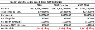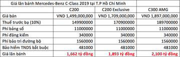 Với giá bán khởi điểm từ , Mercedes-Benz C-Class 2019 sẽ có mức giá tổng cộng bao gồm các loại thuế phí cần thiết để chính thức "lăn bánh" là 1,662 tỷ đồng tại T.P Hồ Chí Minh.