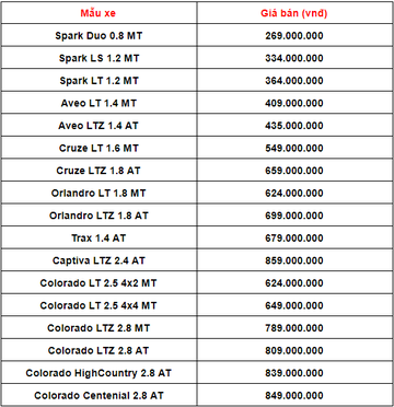 Bảng giá của các phiên bản xe Chevrolet đã bao gồm thuế giá trị gia tăng 10% (VAT) trong tháng 3/2018.