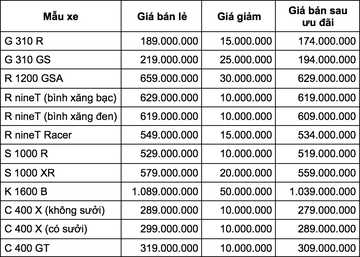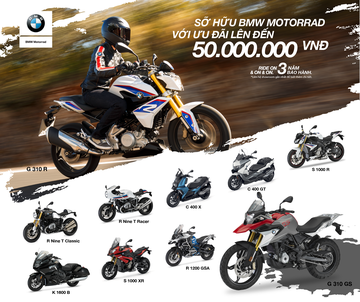 BMW Motorrad Việt Nam vừa triển khai chương trình ưu đãi giá bán lên đến 50 triệu đồng tùy loại dành cho các mẫu xe G 310 R, G 310 GS, C 400 X, C 400 GT, R 1200 GS Adventure, R nineT, R nineT Racer, S 1000 R, S 1000 XR và K 1600 B. Đây là cơ hội duy nhất trong năm để khách hàng có thể sở hữu chiếc xe mà mình yêu thích với mức giá tốt nhất từ trước đến nay.
