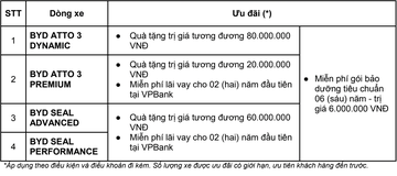 Trong khuôn khổ chương trình, khách hàng khi mua xe BYD ATTO 3 hoặc BYD SEAL sản xuất năm 2024 sẽ nhận được các gói ưu đãi hấp dẫn, bao gồm quà tặng giá trị và hỗ trợ vay tài chính lãi suất 0% trong 24 tháng đầu tại VPBank. Đây là cơ hội thuận lợi để người dùng tiếp cận các mẫu xe điện hiện đại với chi phí đầu tư ban đầu hợp lý, đồng thời tận hưởng chính sách hậu mãi uy tín từ BYD Việt Nam.
