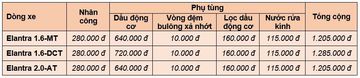 Chi phí để bảo dưỡng Hyundai Elantra tại 10.000 km tại trung tâm dịch vụ chính hãng bạn có thể tham khảo theo bảng dưới đây: