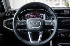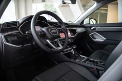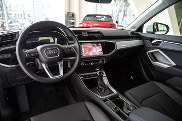 Audi Q3 mạng đậm phong cách điển hình của xe việt dã với tầm nhìn xung quanh rất tốt, đồng thời vẫn cung cấp vị trí ghế ngồi thể thao. Nội thất cũng hiển thị như trên những mẫu lớn hơn và sang trọng của thương hiệu. Màn hình trước (làm nhiệm vụ cụm đồng hồ tốc độ) của Q3 rộng 10,25 inch có thể điều khiển trên vô-lăng.