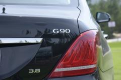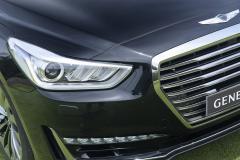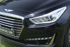 Genesis G90 nổi bật với kích cỡ lớn nhất trong phân khúc với số đo Dài x Rộng x Cao lần lượt là 5.205 x 1.915 x 1.495 mm, cùng chiều dài cơ sở 3.160 mm. G90 mang trên mình một ngoại hình mượt mà với dáng vẻ bệ vệ, quyền uy không kém phần cá tính. Điểm nhấn của xe là logo hình cánh chim và lưới tản nhiệt "Crest" hình lục giác mạ chrome và cụm đèn pha Dynamic HID, dải đèn LED chiếu sáng ban ngày tạo hình khóe mắt long lanh.