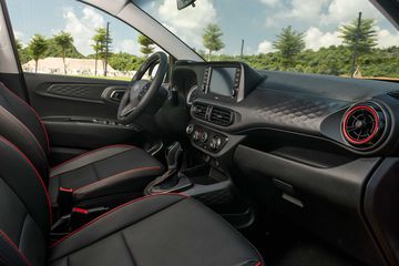 Nội thất Grand i10 thế hệ hoàn toàn mới được bọc da màu tối, kết hợp cùng đường viền màu đỏ làm nên phong cách trẻ trung và thể thao. Màn hình ODO của xe là loại semi-digital với màn hình thông tin dạng TFT kích thước 5,3 inch.