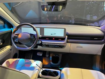 Bảng táp lô của Hyundai IONIQ 5 được thiết kế theo phong cách tối giản Minimalism loại bỏ các chi tiết thừa, kết hợp cùng những công nghệ hiện đại hàng đầu. IONIQ 5 trang bị cặp màn hình có kích thước 12,3 inch nối liền: màn hình cảm ứng thông tin & màn hình giải trí, thiết lập đa chức năng.