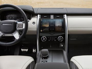 Ở phía trước, vô-lăng bốn chấu kiểu dáng mới mạnh mẽ và khỏe khoắn tương tự trên mẫu Land Rover Defender, tinh chỉnh để phù hợp với phong cách sang trọng ở mẫu xe Discovery mới này. Các nút bấm đều thiết kế có ánh sáng nền thay đổi đẹp mắt và tùy theo ngữ cảnh thuận tiện trong việc sử dụng.