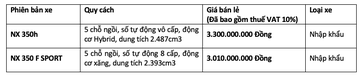 Năm 2015, Lexus NX chính thức được giới thiệu tại Việt Nam và trở thành sự lựa chọn hàng đầu của các doanh nhân trẻ, yêu thích những chiếc SUV sang trọng, năng động và tinh tế. Lexus NX 350 mới được phân phối với giá bản lẻ như sau: