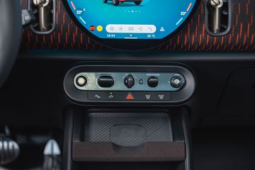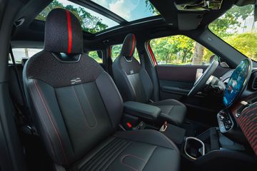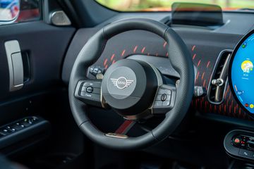 Ghế ngồi JCW thể thao ôm sát cơ thể, được bọc da cao cấp với chỉ khâu đỏ nổi bật và logo JCW dập nổi trên tựa đầu. Vô lăng 3 chấu thể thao bọc da Nappa, tích hợp lẫy chuyển số và nút điều khiển cảm ứng, đem lại cảm giác lái đầy phấn khích.