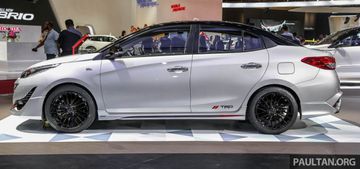 Tại triển lãm ô tô quốc tế Indonesia, Toyota Vios TRD xuất hiện với phần thân xe màu bạc và mui được sơn đen ấn tượng. Ngoại thất hầm hố hơn với bodykit TRD chính hãng gồm cản gầm trước/sau, ốp hốc hút gió và sườn hai bên cùng một cánh gió nhỏ phía sau. Xe sử dụng bộ la-zăng hợp kim 17 inch đa chấu bắt mắt hơn so với bản 15 inch tiêu chuẩn.