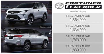 Toyota Fortuner tại Thái Lan có tên phiên bản là Legender với 4 phiên bản, 2 bản số tự động 1 cầu và 2 bản số tự động 2 cầu. Không còn lựa chọn hộp số sàn như trước đây.