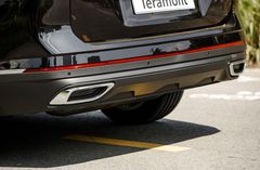 Kết hợp với hệ thống đèn hậu LED và bộ mâm 20 inch lớn tạo ra một dấu ấn độc đáo mang tính biểu tượng cho riêng Volkswagen Teramont. Khả năng off-road của Teramont còn được nâng cấp nhờ khoảng sáng gầm xe 235 mm, đi cùng góc tiếp cận/ góc thoát độ là 20.4/ 22.3 độ. Gương chiếu hậu chỉnh điện, tự sấy, tự động điều chỉnh khi lùi xe.