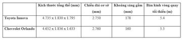 Nhìn vào bảng thông số chúng ta thấy, mẫu MPV đến từ Nhật có khoảng sáng gầm cao hơn đáng kể và bán kính vòng quay tối thiểu tốt hơn so với Chevrolet Orlando, giúp xe vận hành linh hoạt hơn trong điều kiện đường sá gồ ghề. Kích thước tổng thể và chiều dài cơ sở của Innova cũng nhỏ gọn hơn, giúp mang lại khả năng di chuyển trong điều kiện đường sá chật chội tốt hơn so với Orlando.