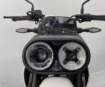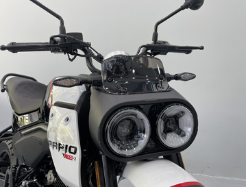 Phần đầu xe CFMOTO Papio XO2 nổi bật với cụm đèn pha LED có thiết kế sắc sảo, góc cạnh. Đèn pha được thiết kế theo dạng projector, cho khả năng chiếu sáng mạnh mẽ và tập trung. Điểm nhấn là dải đèn LED định vị ban ngày hình chữ V ngược, tạo nên một diện mạo độc đáo và dễ nhận diện cho xe.