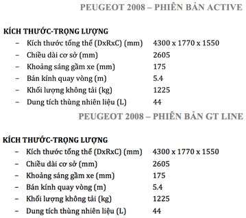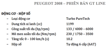 Về động cơ, cả 2 phiên bản Peugeot 2008 GT-Line và Active sử dụng chung với nhau và cùng thông số: