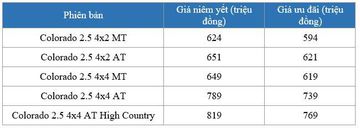 Ngoài Trailblazer, mẫu bán tải Colorado cũng được giảm giá trong tháng 5 nhưng với mức thấp hơn, từ 30-50 triệu đồng tuỳ phiên bản: