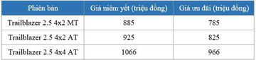 Cụ thể giá bán 3 phiên bản của Chevrolet Trailblazer sau khi áp dụng ưu đãi là như sau: