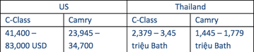 Tại nơi được mệnh danh có giá bán "thiên đường" là Mỹ lại đến gần 20.000 USD. Tại Thái Lan thì con số chênh lệch cũng không hề nhỏ. Và sắp tới các dòng xe hạng D nhập khẩu từ Thái Lan được miễn thuế nhập khẩu thì C-Class do lắp ráp trong nước vẫn phải chịu thuế nhập khẩu linh kiện. Nhưng kết quả là giá bán tại C-Class so với các dòng sedan hạng D chỉ chưa đến 200 triệu đồng tức chưa đến 9.000 USD.