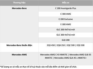 Ngoài những dòng xe chủ lực như GLC, C-Class và E-Class, MBV sẽ đồng hành cùng NPP để mang đến cho khách hàng dàn xe sang đa dạng nhất, bao gồm những mẫu xe đặc biệt như AMG hiệu năng cao, hay những mẫu xe EQ thuần điện vừa ra mắt trong tháng 09.2023. Cụ thể như sau: