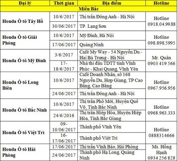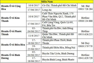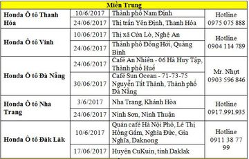 Lịch lái thử chi tiết tại các đại lý Honda Ô tô trên toàn quốc: