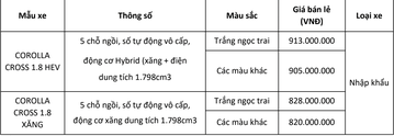 Mẫu xe Corolla Cross 2024 sẽ có mặt tại hệ thống đại lý Toyota trên toàn quốc vào ngày 06/05/2024 với giá bán lẻ chính thức như sau: