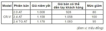 Mức giá giảm dựa trên giá của khách hàng đàm phán tại thời điểm này với các đại lý và dựa trên khuyến mãi của các hãng xe. Theo đó, Honda CR-V là mẫu SUV có mức giảm cao nhất lên tới 100 triệu đồng cho bản 2.4 AT. Đứng thứ hai là mẫu X-Trail của Nissan, mức giảm cao nhất là 70 triệu đồng, áp dụng cho bản tiêu chuẩn 2.0 Mid 2WD.
