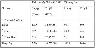 Theo số liệu thống kê sơ bộ của Tổng cục Hải quan, trong tuần qua từ ngày 31/8/2018 đến ngày 6/9/2018 lượng ô tô nguyên chiếc các loại đăng ký tờ khai hải quan nhập khẩu giảm 27% so với lượng nhâp khẩu trong tuần trước.