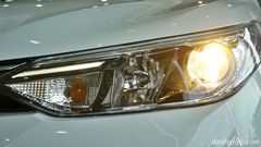 Phần đầu xe Toyota Vios vẫn nổi bật với cụm lưới tản nhiệt hẹp và hốc gió cản trước hình thang ngược cỡ lớn. Trên phiên bản G vẫn trang bị đèn pha halogen projector, tích hợp đèn LED chiếu sáng ban ngày, đèn chờ dẫn đường Follow me home và tự động bật/tắt.