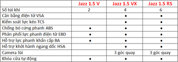 Danh sách trang bị an toàn trên 3 phiên bản lần lượt như sau: