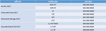 Điều này dường như đang bị người tiêu dùng không mấy ưng ý, khi các đối thủ đáng gờm như Hyundai Grand i10 sedan, Mitsubishi Attrage hay Kia Rio vốn có lợi thế hơn về mặt tên tuổi lẫn thiết kế và trang bị. Đổi lại Chevrolet Aveo 2017 có được giá thành hợp lý để làm lợi thế cạnh tranh. Tại Việt Nam hai phiên bản LT 1.4 MT (số sàn) và LTZ 1.4 AT (số tự động). Giá bán tương ứng cho 2 phiên bản này lần lượt là 459 triệu đồng và 495 triệu đồng. Giá bán danh cho các đối thủ của Aveo 2017 như sau: