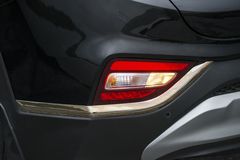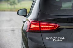 Ở phía sau, phần đuôi xe Hyundai SantaFe 2019 tạo hình khá bệ vệ mang đến sự vững chãi cho tổng thể. Cặp đèn hậu LED tái thiết kế với phần đồ họa 3D đẹp hơn, đèn LED báo phanh phụ bố trí ở đuôi lướt gió, hai cụm đèn phản quan đặt thấp tạo thành năm vị trí báo hiệu hết sức hiệu quả cho các phương tiện khác.