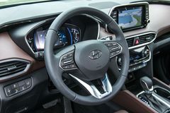Ở vị trí người lái, vô-lăng mới bọc da, cảm giác cầm đầm và chắc tay hơn. Các phím bấm gồm đàm thoại rảnh tay, điều chỉnh âm thanh, ga tự động cruise control và lẫy chuyển số phía sau. Bốn phiên bản Đặc Biệt/Premium hiện đại hơn với màn hình hiển thị thông số dạng LCD kích thước 7-inch, 2 bản thấp là màn Analog 3,5-inch. Ngoài ra, hai bản Hyundai SantaFe 2019 Premium có thêm màn HUD hiển thị trên kính lái giúp tài xế dễ dàng quan sát tình trạng xe hơn.