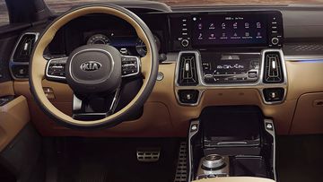Bước vào khoang lái, chi tiết gây ấn tượng mạnh nhất là 2 màn hình cỡ lớn. Cụ thể gồm màn hình thông tin giải trí kích thước 10.25 inch và bảng đồng hồ kỹ thuật số hoàn toàn, kích thước 12.3 inch. Sự có mặt của 2 màn hình này giúp khoang lái Sorento 2021 trông hiện đại và công nghệ hơn hẳn.