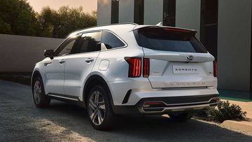 Ở phần đuôi Sorento 2021, chi tiết ghi điểm lớn nhất chính là cụm đèn hậu LED đặt dọc lấy cảm hứng từ mẫu flagship Kia Telluride. Tuy nhiên không như trên Telluride, cụm đèn trên Sorento được tách đôi, kết hợp với hai đường vát nối liền đến phần trung tâm cùng tên xe cỡ lớn tạo cảm giác mở rộng về không gian cũng như nhấn mạnh tổng thể góc cạnh của xe. Cánh lướt gió đã được gia tăng kích thước so với bản tiền nhiệm nhằm tăng cường vẻ năng động cũng như góp phần cải thiện tính khí động học.