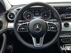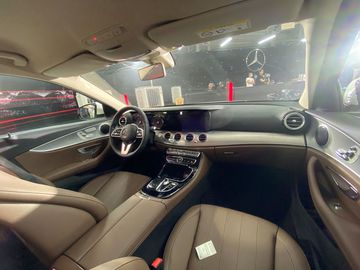 Bên trong khoang nội thất, E 180 được ốp nhôm trên táp-lô và ốp gỗ đen trên cụm điều khiển trung tâm. Tay lái đa chức năng 3 chấu thiết kế mới được bọc da nappa với nút điều khiển bằng cảm ứng. E 180 vẫn được trang bị màn hình giải trí 12,3 inch cực kỳ sắc nét.