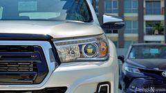Phần đầu xe vẫn trang bị đèn pha halogen phản xạ đa chiều tiêu chuẩn. Riêng phiên bản Hilux 2.8 G sẽ có đèn chiếu gần LED projector tích hợp đèn LED ban ngày và các tính năng tự động bật/tắt, tự động cân bằng góc chiếu. Trong khi các phiên bản thấp hơn sẽ gia giảm các tính năng để phù hợp với giá bán.