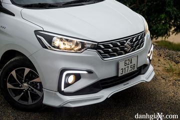 Phía dưới, phần cản trước cũng được mở rộng ra hai bên, ốp nhựa đen nối liền với hai cụm đèn sương mù. Trên Suzuki Ertiga 2023 có thêm dải đèn LED ban ngày đẹp mắt hơn, tăng thêm vẻ hiện đại cho mẫu xe MPV này.