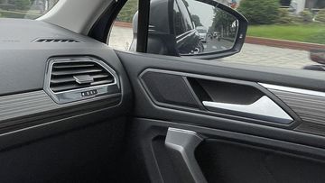 Gương chiếu hậu Volkswagen Tiguan 2023 sử dụng thiết kế trên cạnh cửa như trước đây và phần ốp sơn bạc cũng được giữ lại. Thiết kế này mang đến nét hiện đại, đồng thời giúp mở rộng tầm nhìn cho người lái. Gương chiếu hậu cũng đầy đủ chức năng chỉnh điện, gập điện, tự sấy và tích hợp đèn báo rẽ. Ngoài ra, có thể đồng bộ nhớ vị trí với ghế lái, đem lại sự tiện dụng tối đa cho người lái.