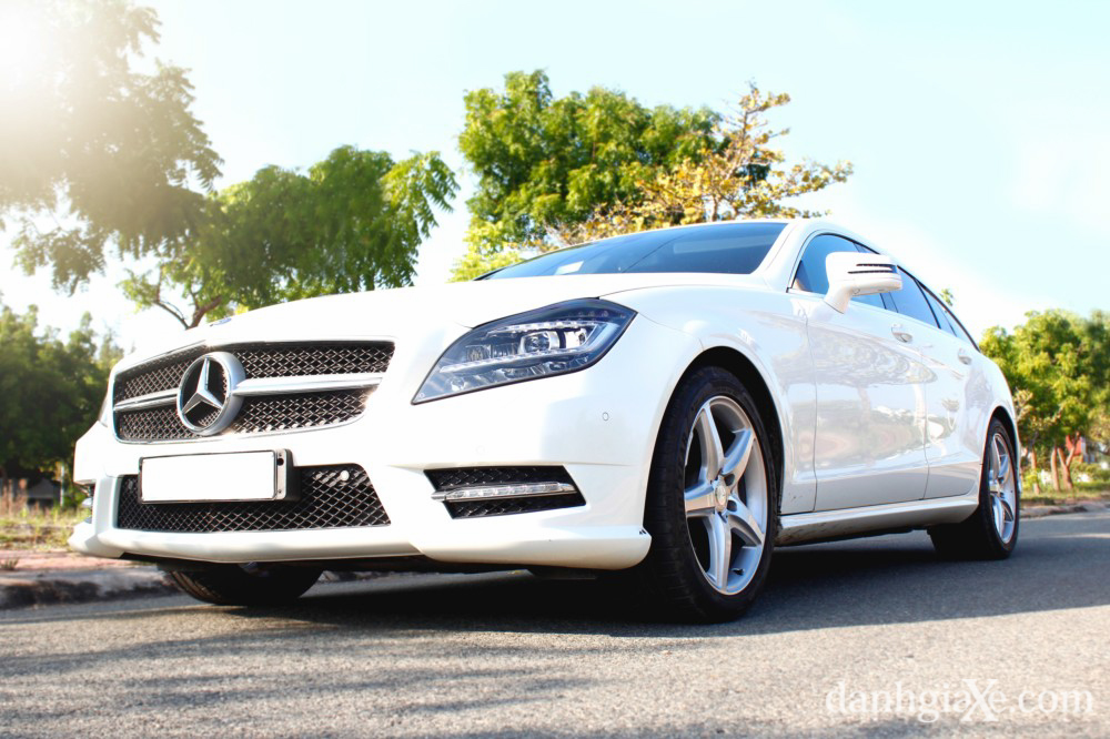 Đầu xe Mercedes-Benz CLS350 Shooting Brake ấn tượng với ngôi sao 3 cánh lớn nằm ngay trung tâm, lưới tản nhiệt chỉ một thanh chắn ngang cứng cáp và mạnh mẽ. Cụm đèn xe kiểu hình khối chứ không dẹt như thế hệ cũ. Công nghệ đèn pha Full-LED với 71 bóng đèn LED phát quang tạo hình khá độc đáo mang một phong cách khá ngầu cho đầu xe. Đi kèm đó là chức năng điều chỉnh khoảng sáng của đèn pha giúp chống chói cho xe ngược chiều khi đi xe vào ban đêm, hệ thống rửa đèn pha tự động, dãy đèn LED định vị ở phía dưới cản trước.