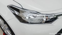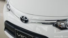 Đầu xe Toyota Vios 2017 vẫn nổi bật với thanh mạ chrome nối liền hai cụm đèn pha halogen projector cho phiên bản G và halogen phản xạ đa chiều cho hai phiên bản thấp cấp hơn. Ấn tượng lớn nhất ở đầu xe chính là cản trước với hốc hút gió hình thang cỡ lớn, giúp phần đầu xe khỏe khoắn hơn hẳn, cộng với cụm đèn sương mù chếch nhẹ lên trên tăng độ hầm hố cho Vios 2017.
