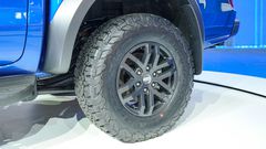 Bề ngang của Ranger Raptor “đô” hơn với các hốc bánh lớn, ốp viền nhựa đen giúp bảo vệ thân xe khỏi bùn, đá khi chạy off-road. La-zăng dạng hợp kim 6 chấu kép, kích thước 17-inch đi cùng bộ lốp BF Goodrich đa địa hình. Với combo này thì có thể nói là Ranger Raptor sẽ không “ngán” bất cứ địa hình nào.
