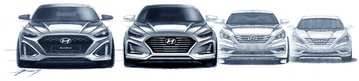 Phần đầu xe của Hyundai Sonata được trang bị lưới tản nhiệt giống hệt trên Hyundai i30 mới. Xe trang bị cụm đèn pha tái thiết kế, hốc gió 2 bên góc cản va trước được mở rộng tích hợp thêm đèn Led định vị ban ngày theo dải dọc, nắp ca-pô cũng mang diện mạo mới vói 2 đường gần dập nổi thể thao.