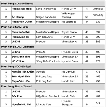 Với 31 xe thi đấu tại phân khúc Best of Sound, EMMA 2023 đã phải chia thành 2 bảng để chọn ra 6 xe có kết quả tốt nhất để bước vào vòng 2. Kết quả chung cuộc, xe VinFast Lux A của thí sinh Lê Khá đến từ ProAuto đã giành chiến thắng ở hạng mục này với điểm số rất cao.