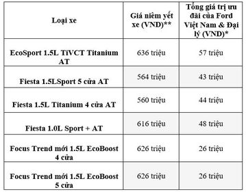 Nhằm hỗ trợ khách hàng mua xe đón Tết Mậu Tuất, Ford Việt Nam công bố chương trình khuyến mại đầu năm 2018 cho các dòng xe lắp ráp trong nước với mức giảm cao nhất thuộc về bản Titanium của EcoSport với 57 triệu đồng. Trong khi đó, Ford Fiesta được giảm giá từ 43-48 triệu đồng cho cả 3 phiên bản Sport, Sport+ và Titanium; Focus giảm 26 triệu đồng cho phiên bản Trend tiêu chuẩn.