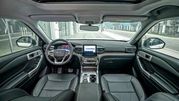 Vô lăng của Ford Explorer 2024 là loại 4 chấu bọc da kết hợp 2 nan ở phần đáy được sơn bạc. Bên cạnh hỗ trợ chỉnh điện 4 hướng, tay lái còn tích hợp đầy đủ các phím bấm chức năng được bố trị gọn gàng, thuận tiện thao tác như ra lệnh bằng giọng nói, đàm thoại rảnh tay, kết nối Apple CarPlay & Android Auto, Wifi, AUX, USB, Bluetooth… Bảng đồng hồ ngay phía sau bao gồm 2 đồng hồ analog đối xứng qua màn hình hiển thị đa thông tin kích thước 6.5 inch.