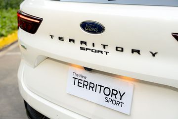 Thiết kế ngoại thất của Ford Territory Sport nổi bật so với các phiên bản còn lại ở hàng loạt chi tiết được sơn đen như viền đèn sương mù, ốp viền đèn pha, ốp gương chiếu hậu, thanh giá nóc, lưới tản nhiệt, vành hợp kim 18 inch và logo Territory Sport màu đen ở phía đuôi xe. Cách phối màu mới đem đến cho Ford Territory cái nhìn thể thao và cao cấp hơn.