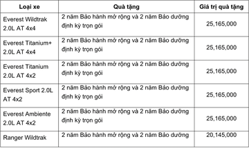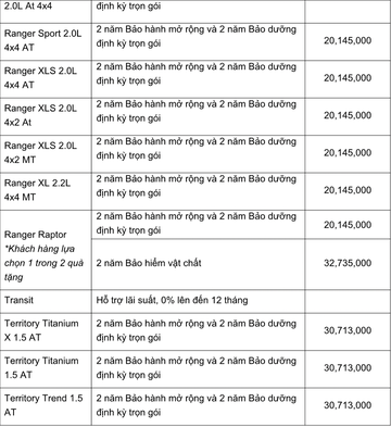 Tháng 5 này, Ford Việt Nam và hệ thống Đại lý triển khai hàng loạt chương trình ưu đãi đặc biệt dành cho khách hàng mua xe mới: khuyến mại gói Bảo hành mở rộng, gói Bảo dưỡng định kỳ cho khách hàng mua các dòng xe Everest, Ranger, Raptor, Territory; gói hỗ trợ lãi suất 0% trong 12 tháng đầu tiên dành riêng cho khách hàng mua xe Transit. Chi tiết thông tin khuyến mại dành cho khách hàng mua Everest, Ranger, Raptor, Transit, Territory như sau: