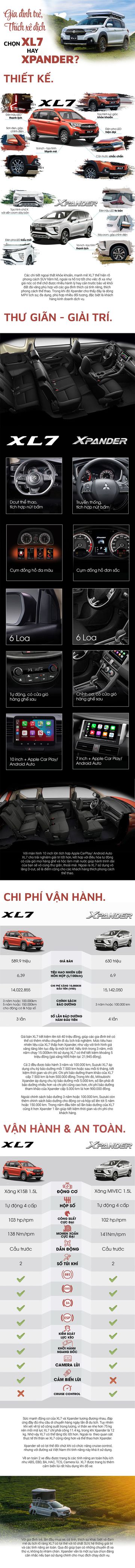 Suzuki XL7 và Mitsubishi Xpander luôn là 2 lựa chọn hàng đầu cho các gia đình trẻ, lần đầu mua xe thích đi du lịch bởi có thiết kế hợp thời, thoải mái rộng rãi, chi phí sử dụng tiết kiệm.